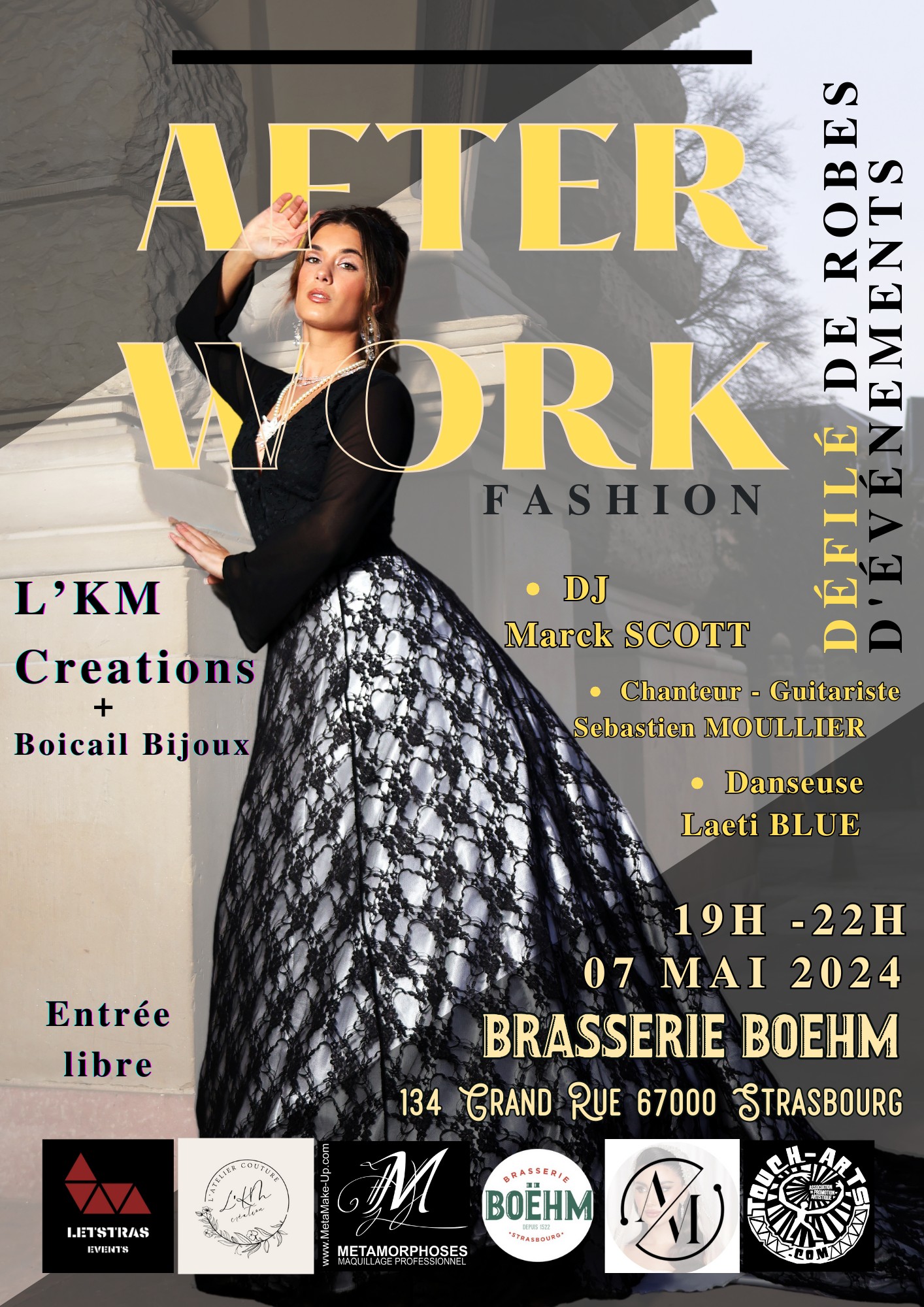✨Rejoignez-nous le mardi 7 mai 2024 à partir de 19h à la Brasserie Boëhm à Strasbourg pour un Afterwork-fashion avec au programme : un défilé de robes d’évènements L’KM créations et des bijoux Boicail, suivi d’une danse Chair Dance de Laeti Blue et de 2 reprises de Sébastien Moullier, chanteur et guitariste. Le DJ Marck Scott animera l’afterwork de 19 à 22h.