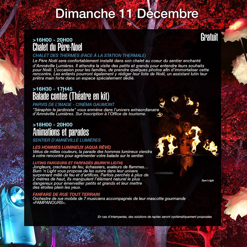 Si les structures sont visibles du 3 décembre 2016 au 2 janvier 2017, il y aura aussi 10 dates de temps forts avec des animations différentes tout aussi féeriques de 18h à 20h en déambulation sur le parcours :