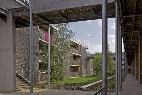 La cour-jardin est pensée comme un espace collectif protégé, animé et planté. Elle organise la transition entre vie publique et vie privée, depuis les rues jusqu’aux portes palières. Un aménagement ombragé permet de s’y arrêter, de s’y reposer, d’échanger ou de jouer. des échappées visuelles sont ménagées vers l’extérieur, l’espace est cependant protégé de l’ambiance de la rue et des bruits de circulation.