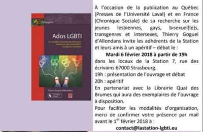 À l’occasion de la publication au Québec (Presses de l’Université Laval) et en France (Chronique Sociale) de sa recherche sur les jeunes lesbiennes, gays, bisexuel(le)s, transgenres et intersexes, Thierry Goguel d’Allondans invite les adhérents de la Station et leurs amis à un apéritif - débat le :