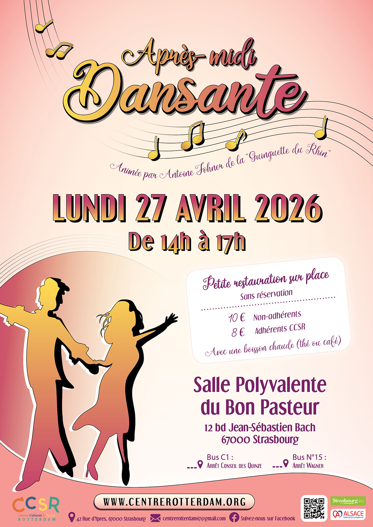 Après plusieurs éditions effervescentes, nous vous invitons à danser le lundi 27 avril 2026, pour encore plus de plaisir ! De 14h à 17h, tous les amoureux de la musique sont les bienvenus à la salle polyvalente du Bon Pasteur, au 12 boulevard Jean-Sébastien Bach à Strasbourg.