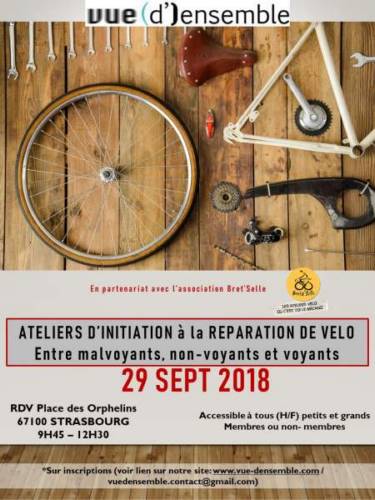 Vue (d’) ensemble en collaboration avec l’association Bretz’Selle démirent une série d’atelier d’initiation à la réparation de vélo accessible aux malvoyants, non-voyants et voyants ensemble, qui démarrent le 29 septembre 2018 à la Place des Orphelins à Strasbourg de 9H45 à 12H30.