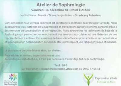 Dans cet atelier nous verrons comment est construite la méthode du professeur Caycedo. Nous découvrirons les 5 systèmes de la Sophrologie et travaillerons sur notre schéma corporel grâce à des exercices de concentration et de respiration. Nous aborderons les techniques de base de la Sophrologie qui permettent un relâchement des tensions musculaires et une libération de nos représentations mentales. Ces exercices de base sont efficaces pour améliorer la concentration et la récupération notamment en période de stress provoquant une fatigue physique et mentale.