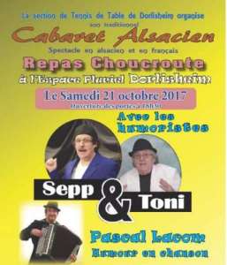 Samedi 21 octobre 2017 à l’Espace Puriel de Dorlsheim, la section Tennis de table de Dorlisheim vous propose son Cabaret Alsacien !
