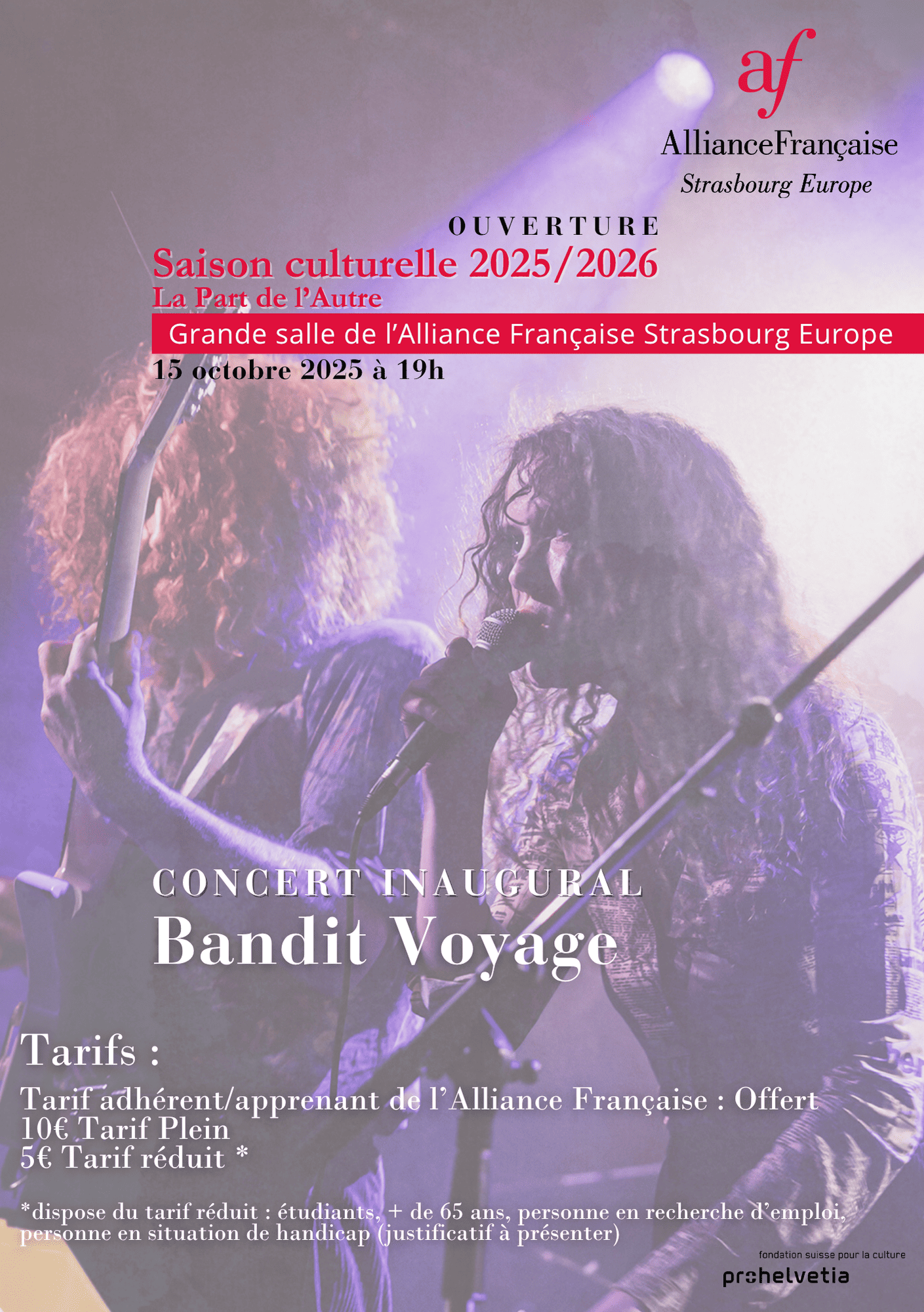 L'Alliance Française de Strasbourg a le plaisir de vous convier à la soirée d'ouverture de sa nouvelle saison culturelle 2025-2026, avec un concert exceptionnel de Bandit Voyage !