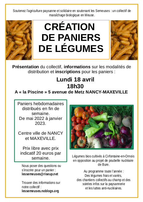Pour la mise en place de nos paniers de légumes, venez nous rencontrer pour découvrir notre collectif et vous inscrire pour avoir des légumes bios paysans frais et variés toute l'année !