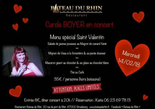 Venez passer une soirée de la Saint Valentin en couple ou entre amis dans un cadre atypique .. Le Bateau du Rhin.. avec un concert très glamour de Carole Boyer qui saura vous faire voyager l’instant d’une soirée au rythme du jazz et du latino... Une artiste de talent pour passer une soirée de la Saint Valentin réussie! Menu unique à 35€/pers (hors boissons). Info et résa: Katia au 06 23 69 78 13 Attention ce n’est pas un bateau mais une bâtisse!