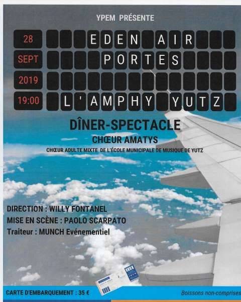 Un dîner spectacle "EDEN AIR PORTES" se produira le 28 septembre à 19h à l’ AMPHY - soirée pleine de surprises musicales et théâtrales au cours de laquelle le choeur AMATYS se fera fort d’emporter le public dans ses bagages avec une bonne dose d’humour et de sensibilité.