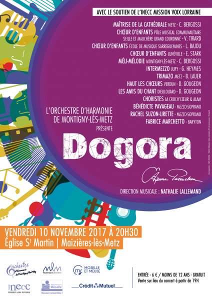 L’Orchestre d’Harmonie de Montigny-lès-Metz présente "Dogora" d’Etienne Perruchon, réalisé avec le soutien de l’INECC Mission Voix Lorraine. Ce concert réunira 1 orchestre, 4 chorales d’enfants, 5 chorales adultes et 2 solistes, soit plus de 200 participants. Avec les chorales Méli-Mélodie de Montigny-lès-Metz, Trimazo de Metz, Intermezzo de Jury, Haut les Choeurs de Verdun, Les amis du chant de Dieulouard, la Maîtrise de la Cathédrale de Metz, les Choeurs d’enfants des écoles de musique de Sarreguemines, de Nomény et de Lunéville. Solistes : Rachel Suzon-Lirette & Fabrice Marchetto. Direction musicale : Nathalie Lallemand