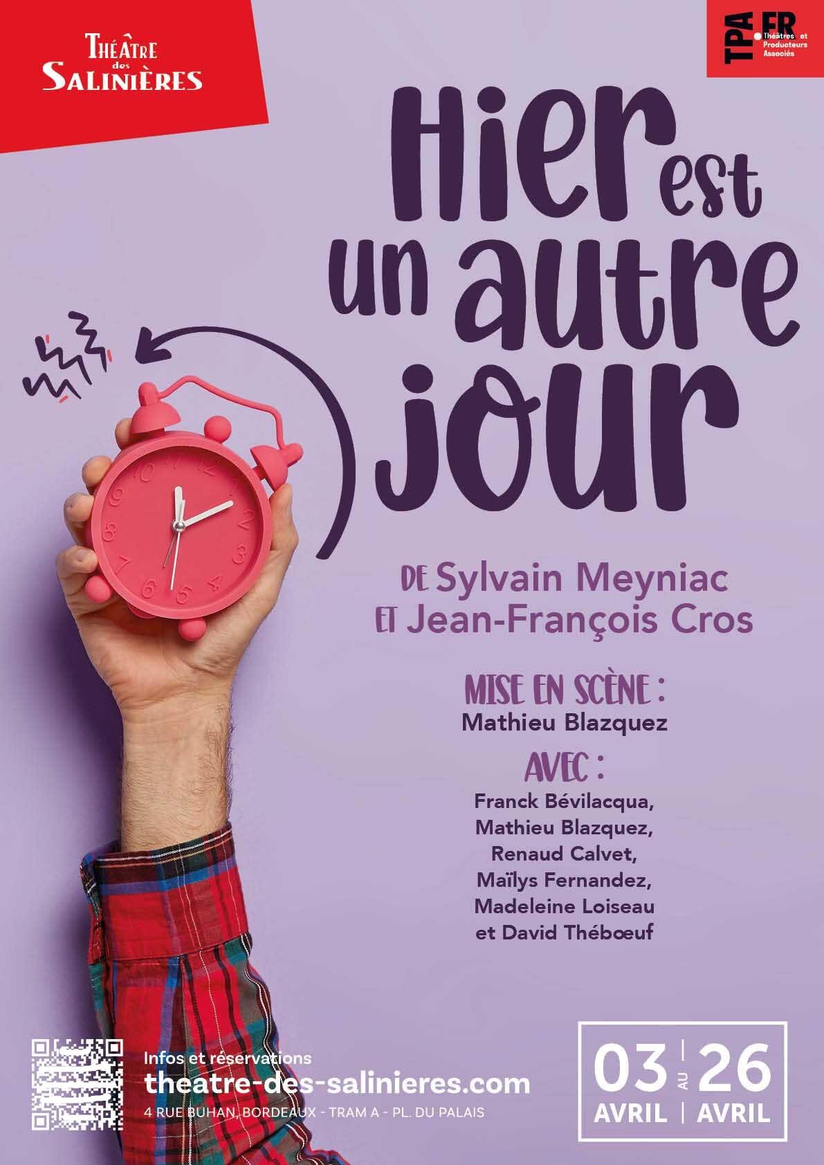 ATLANTIC PRODUCTIONS PRÉSENTE : HIER EST UN AUTRE JOURHIER EST UN AUTRE JOURComédie de Sylvain MEYNIAC & Jean-François CROS Avec : Franck Bévilacqua, Mathieu Blazquez, Renaud Calvet, Maïlys Fernandez, Madeleine Loiseau et David TheboeufMise en scène : Mathieu BLAZQUEZDurée : 1h30 RESUME :Pierre Maillard, avocat rigide et bourré de tocs, prépare le procès de sa vie !Il est persuadé d'avoir la promotion qu'il mérite et ne se méfie pas une seconde de son patron et collègue.A quelques heures du procès, un étrange personnage vient toquer à sa porte et va bouleverser sa vie bien rangée, en lui faisant vivre une journée sans fin, dingue et absurde où les mêmes événements se répètent jusqu'au délire !Des pieds qui se prennent dans le tapis, des cigares qui disparaissent, des crayons qui se planquent et un cochon qui se fait la malle, Pierre deviendrait-il complètement fou ?OUSur le point de conclure le procès de sa vie, Pierre, un avocat froid et rigide, bourré de principes, va se retrouver obligé de partager une très très longue journée avec l'homme le plus imprévisible et le plus incroyable qui soit. Une rencontre improbable qui va bouleverser la vie de l'un comme de l'autre. Une journée de dingues, absurde, où rien n'est prévu, rien n'est attendu, où tout est possible...