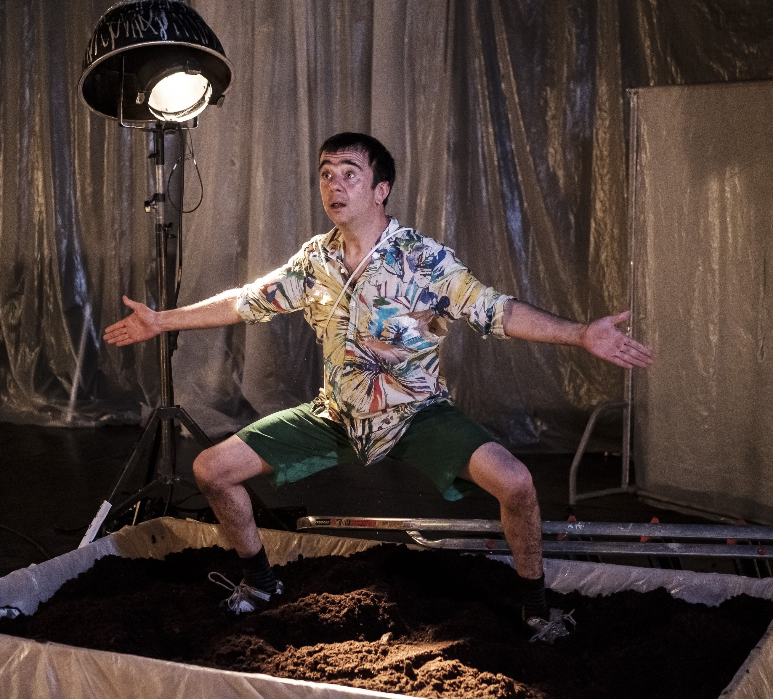 Un laboratoire d’observation avec une table, une chaise et un bac rempli de terre. Et dans ce laboratoire, deux individus : une conférencière scientifique qui propose un cours d’histoire de la Vie en accéléré et un spécimen d’une espèce en voie de disparition, l’Homo Sapiens.