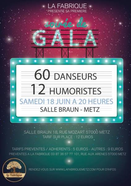 La Fabrique - Espace artistique et créatif vous convie à sa toute première soirée de Gala ! Retrouvez 60 danseurs et 12 humoristes, tous issus des ateliers de la Fabrique, pour une soirée unique le samedi 18 juin à la salle Braun, 18 rue Mozart 57000 METZ.