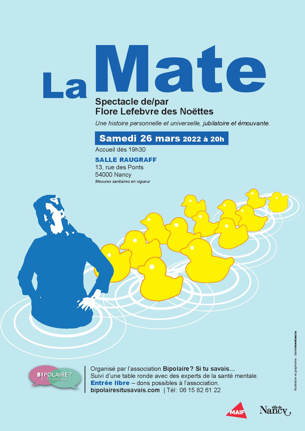 L’histoire de la Mate, par son auteure, Flore Lefebvre des Noëttes : « C’est l’histoire d’une famille dans les années 60, famille nombreuse catholique, dont le père, militaire, Lieutenant-Colonel était bipolaire ; la mère, une « Mère courage », tenue d’élever leurs dix enfants en plus des trois filles qu’il eut d’un premier mariage. A la mort de ma mère, pour la première fois je prends la plume et j’écris l’histoire de notre famille si singulière. (C’est aussi une façon de faire revivre ma mère et d’en faire un hommage). C’est l’occasion pour moi de rire beaucoup. Je reconstruis une nouvelle histoire familiale renversant son tragique en fable comique brossée à la Honoré Daumier.