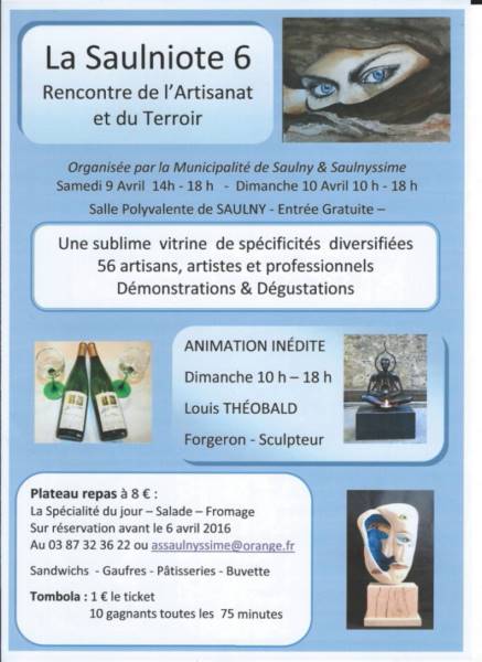 La Rencontre de l’artisanat et du terroir, organisée par la Municipalité et Saulnyssime, accueillera une cinquantaine d’artisans, artistes et professionnels .Certains ont été primés dans des salons français et ou étranger. Bon nombre dévoileront leur savoir-faire, vous feront partager leur passion par des démonstrations. Pour les produits de bouche, possibilité de dégustations. Le dimanche de 10h à 18h, sur le parking, une animation inédite est proposée. Louis Théobald, forgeron sculpteur réalisera une oeuvre sous les yeux du public. Restauration possible le dimanche midi, uniquement sur réservation, plateau-repas à 8 €. Durant ces deux jours, tombola dotée de plus de soixante dix lots offerts par les exposants et Metz Métropole pour le musée de la Cour d’Or.