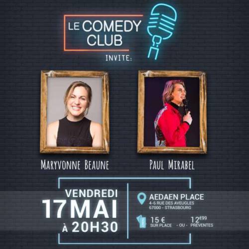 Dernier épisode avant l’été de votre Comedy Club strasbourgeois ce vendredi 17 mai. Pour nous aurons le plaisir d’accueillir Maryvonne Beaune et Paul Mirabel pour ce bel évènement.