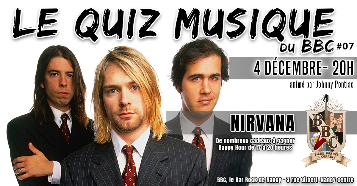 ⥠Jeudi 4 dĂ©cembre Ă 20h, le BBC tâemmĂšne dans lâunivers grunge par excellence. Groupe culte des annĂ©es 90, Nirvana a rĂ©ussi Ă transformer des pulls trouĂ©s et des cheveux gras en symbole mondial. PrĂ©pare-toi Ă au moins 15 questions qui vont remuer autant de nostalgie quâun pogo en 1993.