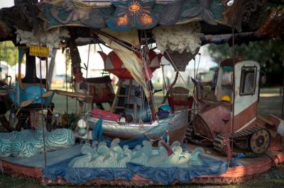 Carrousel cagneux, l’incroyable Titanos est né de l’(art)ccumulation de matières mi-volées, mi-récupérées, sauvagement assemblées. Une attraction détraquée qui porte un coup fatal à l’image figée du carrousel. Les zozos du Titanos vous invitent dans une ambiance foraine décalée, sur fond de commentaires non sportifs.Deux consignes pour monter à bord : Vaccin DT polio à jour, interdiction de ne pas s’amuser.