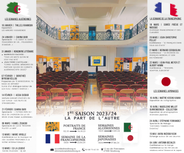 Enrichi par la multitude qui le fait résonner dans tous les pays qui se le sont approprié, le français continue de se transmettre dans le monde entier parce qu’il s’y vit comme une langue d’émancipation et de création. Pour sa programmation artistique et culturelle, l'Alliance française Strasbourg-Europe s'est donné pour ambition de présenter ces auteurs, conteurs, réalisateurs, musiciens, artistes, intellectuels venus d’ailleurs et tous francophones... Elle veut ainsi continuer à faire la part belle à l'autre et aux cultures du monde.