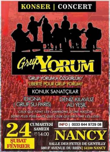 Concert de soutien au "Grup Yorum", groupe turque multi-éthnique au répertoire traditionnel et aux textes revendicatifs, dont 4 membres fondateurs, et 11 autres de leurs musiciens, sont actuellement emprisonnés injustement en Turquie. Avec la présence de David Vincent (15h), du groupe Idigna (16h30), des musiciens Deniz Kilavuz et Ali Yesil (17h30) et de la chorale des sans-noms (15h30), enfin Grup Yorum (19h). Organisé par le Mouvement de la Paix.