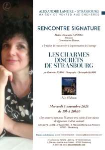 Catherine JORDY, autrice et Stéphane HAMM, photographe, présenteront leur nouvel ouvrage intitulé "Les Charmes discrets de Strasbourg", le mercredi 5 novembre 2025 à 19h00, au 4, place du Marché-aux-Poissons à Strasbourg.