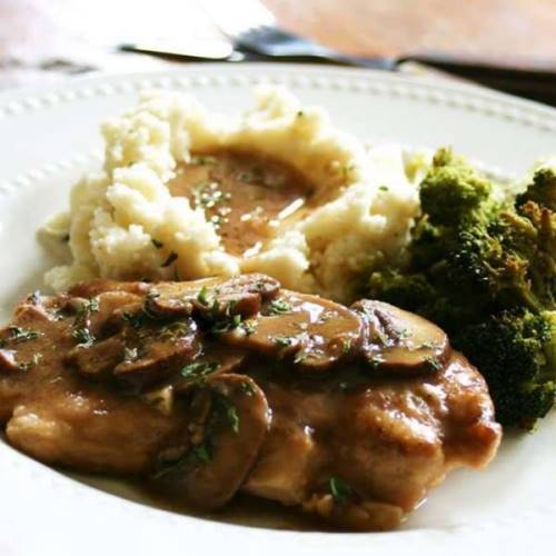 Poule à la crème aux champignon, purée de pommes de terre, salade plus une boisson.