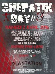 Au programme MC Shepa Accompagné de 10 MC et Musiciens pour un set hétérogène. Le tout agrémenté de sessions Open Mic. Et bien sûr dans la joie et la bonne humeur !! :) Cette soirée sera organisée au profit de l’association A.J.I.S. qui nous fera le plaisir de vous restaurer à base de hod dog de saucisses de volailles mais aussi les les tous nouveaux hot dogs végétariens.