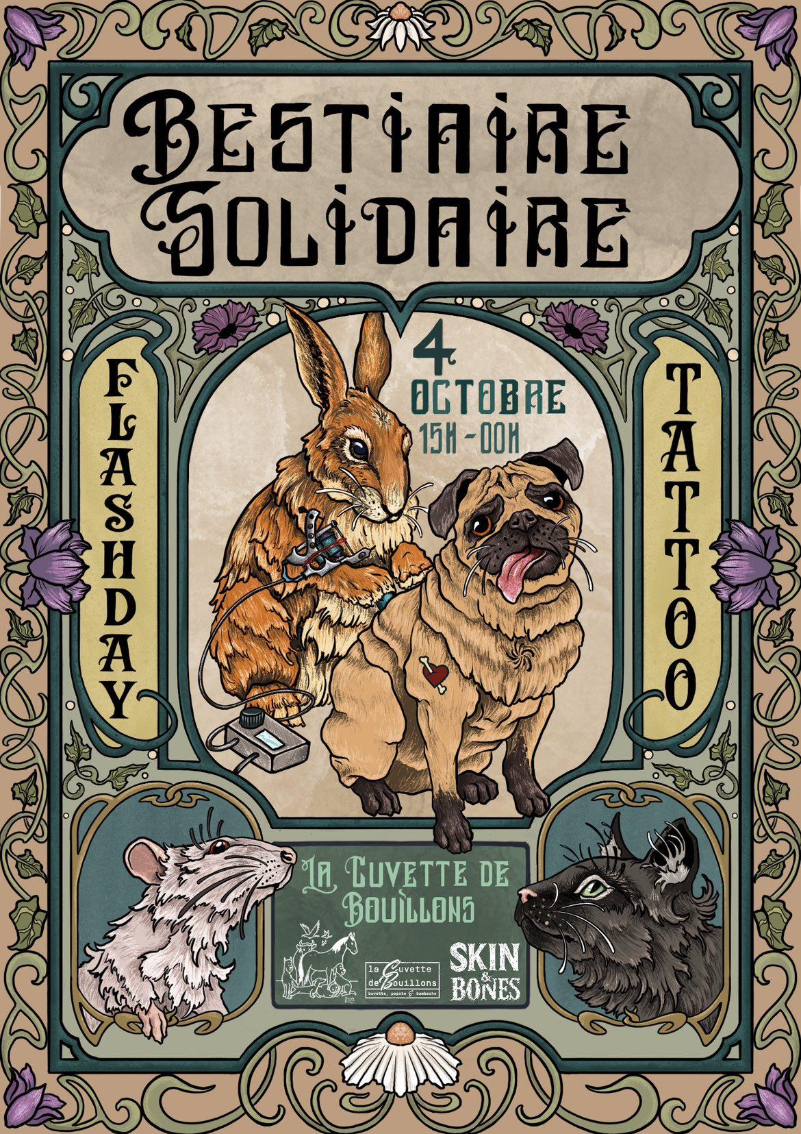 Pour cette première édition le tatouage est à l'honneur. Nous vous invitons le samedi 4 octobre à la cuvette de bouillons , où se tiendra un flash day de 15h à minuit. Plusieurs tatoueurs proposeront des flashs spécialement crées pour l'occasion, et 50% des bénéfices seront reversés à la SPA.