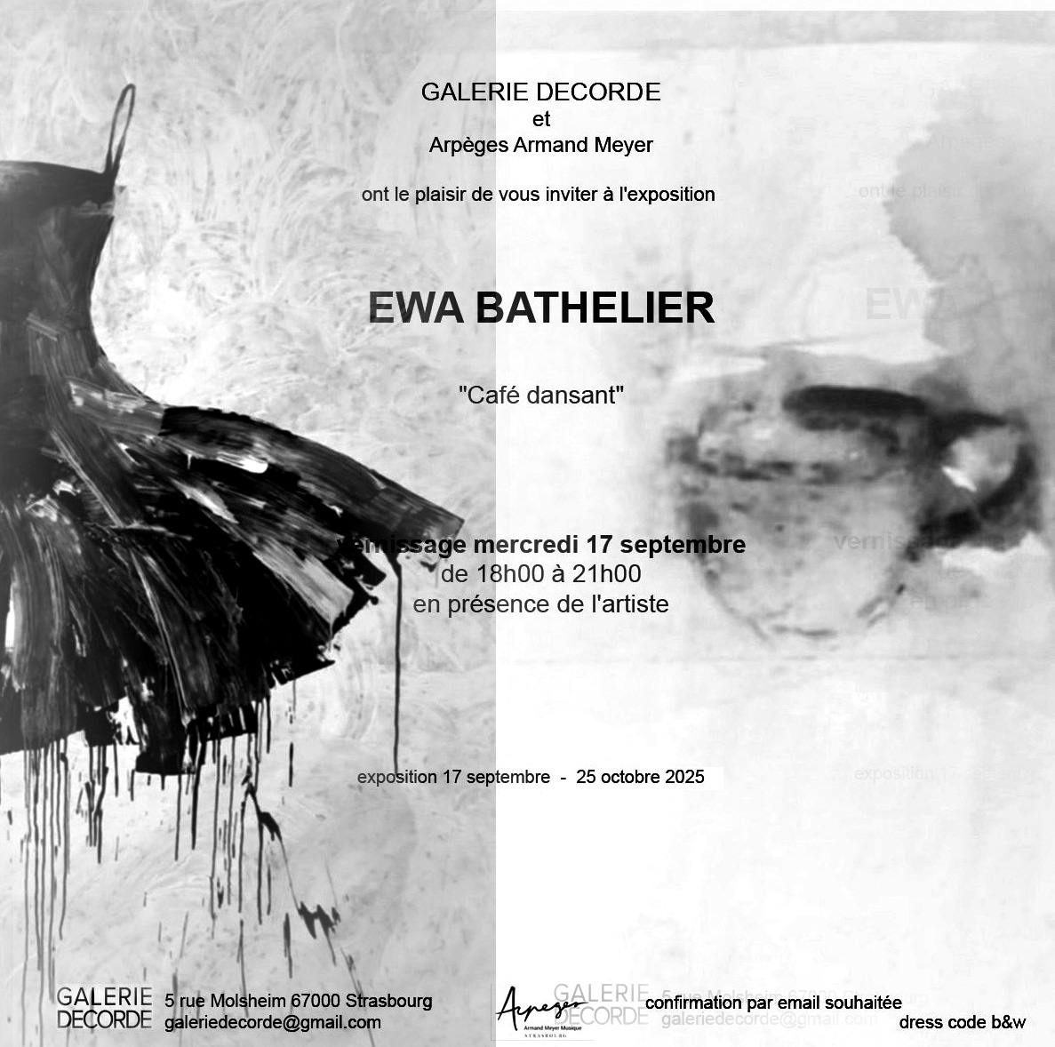 Soirée vernissage qui inaugure l'exposition de EWA BATHELIER. Dress code b&w.
