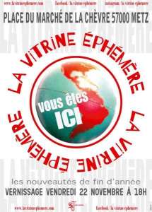 Dès 18h, vendredi 22 novembre, à La Vitrine éphémère, Place du Marché de la Chèvre, Centre Saint Jacques à Metz.Les détails du programme seront annoncés prochainement.