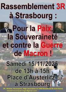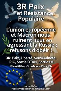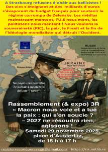 Rassemblement (& expo) 3R « Macron nous vole et a tué la paix, qui s’en soucie ? 2027 ne résoudra rien, agissons ! »