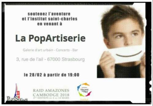 Nous nous réjouissons de vous recevoir à la PopArtiserie 3, rue de l’Ail le mercredi 28 février à 19h pour soutenir l’Institut Saint-Charles dans le cadre de notre participation au Raid Amazones 2018 !