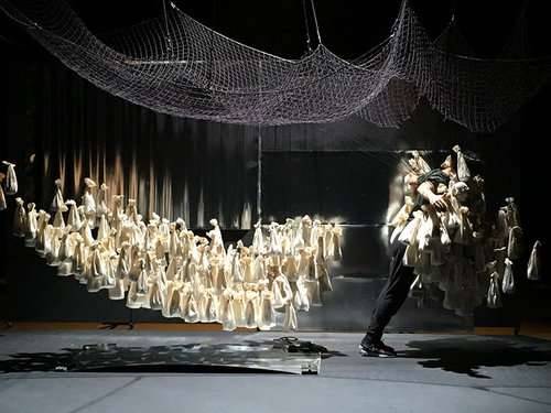 Le metteur en scène et marionnettiste a rêvé cette masse ondulante telle une vague, qui enveloppe les interprètes comme un seul et même corps. Une exploration des limites du possible de la marionnette à fil laissant place à la révélation des flux d’énergies et de liens secrets invisibles – et pourtant physiques – reliant tous ces éléments. Un jeu où les rôles s’emboitent et s’inversent. Où les principes de manipulation s’entendent comme zones d’interactions. Où les échelles se percutent : la foule des êtres miniatures devient un organisme géant quand elle est manipulée d’un seul élan, tandis qu’une marionnette d’environ un mètre tient tête aux interprètes.