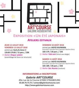 A l’occasion de l’exposition « Un été japonais », la Galerie Art’Course est heureuse de vous proposer plusieurs ateliers de créations textiles qui vous plongeront au cœur de l’art textile japonais ! Mais pas de panique, ces ateliers sont accessibles aux experts en couture comme aux novices (adultes et enfants) ! Le but est de s’amuser !