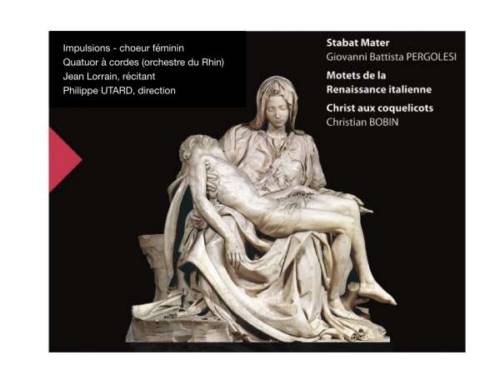 Lors du concert, le public entendra en première partie des motets de la Renaissance italienne (Monteverdi, Orlando di Lasso) et en seconde partie de concert, l’intégralité du Stabat Mater de Giovanni Battista Pergolesi interprété par les choristes accompagnés par les instruments anciens de l’Orchestre du Rhin. En contrepoint du Stabat, Jean Lorrain lira de larges extraits du Christ aux coquelicots de Christian Bobin.