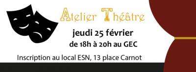 The theater group will take place the 25th Thursday of February from 6p.m to 8p.m at GEC. Obviously, this activity is free but there are only 15 seats. So, come to the ESN office, 13 place carnot, to subscribe.