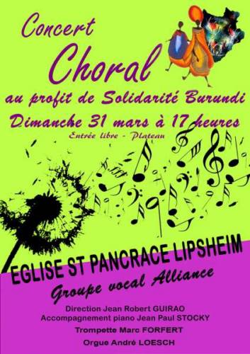 Le concert sera animé par l’ensemble vocal Alliance dirigé par Jean Robert Guirao et par des morceaux pour trompette et orgues par Marc Forfert et André Loesch. Le plateau sera reversé à l’Association pour ses actions au Burundi.
