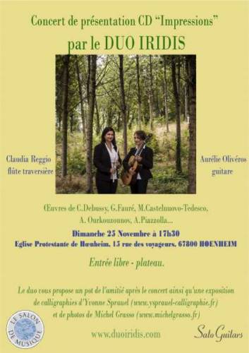 A l’occasion de la sortie de son nouveau disque Impressions, le DUO IRIDIS, composé de Claudia Reggio à la flûte traversière et d’Aurélie Olivéros à la guitare, vous invite à son concert le dimanche 25 novembre à 17h30, à l’église Protestante d’Hoenheim (15, rue des Voyageurs).