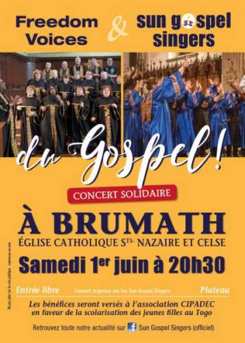 Concert réunissant 2 chorales gospel de la région Strasbourgeoise. Les Sun Gospel Singers avec la participation des Freedom Voices vous partageront leur passion pour le chant Gospel.