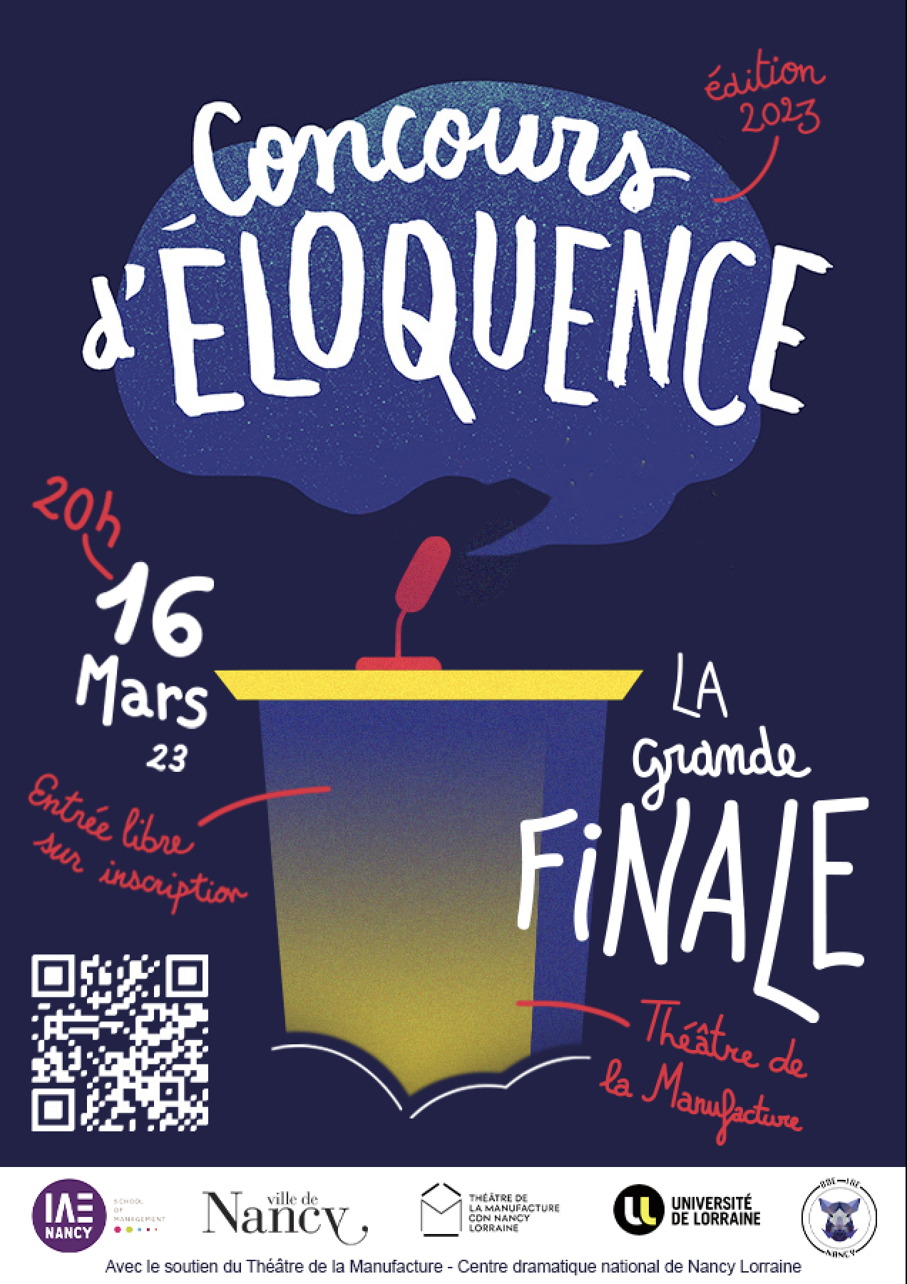 Nous vous attendons le 16 mars à 20h (ouverture des portes à partir de 19h30) dans la salle de la manufacture, 10 Rue Baron Louis, 54000 Nancy, et l'entrée est gratuite.
