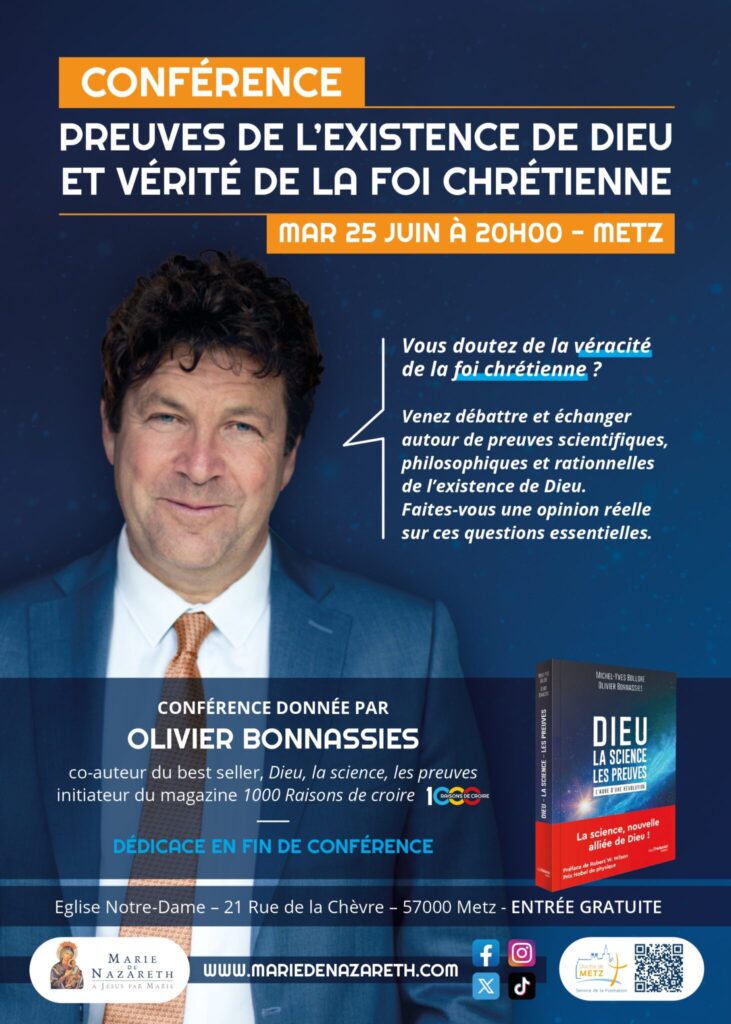 Cette conférence, intitulée « Preuves de l’existence de Dieu et vérité de la foi chrétienne » : sera menée par Olivier Bonnassies, co-auteur du best-seller Dieu, la science, les preuves, à l’initiative du Service de la Formation du Diocèse de Metz.