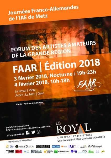 Le FAAR | Forum des artistes amateurs de la Région est une exposition artistique organisée depuis plusieurs années par les étudiants du Master en Management franco-allemand de l’ESM/IAE de Metz, dans le cadre des journées franco-allemandes. Chaque année, ce sont plusieurs artistes passionnés, amateurs comme professionnels, de France et d’Allemagne mais surtout de la Grande Région (Lorraine, Sarre et Luxembourg) qui y sont conviés. Cette exposition permet aux artistes de présenter leurs œuvres devant un large public. De plus, elle a pour but de favoriser les liens culturels entre les deux pays voisins, piliers de l’Union européenne. Pour cette 12ème édition, l’exposition se tiendra les 3 et 4 février 2018 au Royal à Metz.