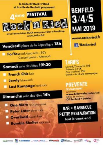 Ouverture du festival par un concert gratuit sur la place de l’Hôtel de Ville à Benfeld par le groupe For You à 18h, puis pour vous un programme sur deux jours à la salle des fêtes de Benfeld, samedi à partir de 19h30 FRENCH CHIC - funk, JEWLY- blues rock et LAST RAMPAGE- hard rock, Dimanche à partir de 14h ONE MORE - pop rock, PETER LATER - blues rock, OVERLOAD – power funk, RUMBLE SHELTER – rock soul.(buvette - petite restauration)