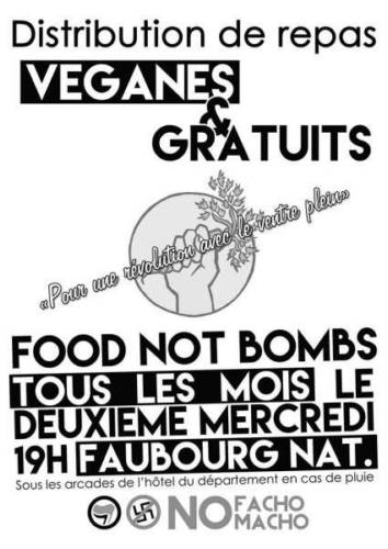 Une fois par mois depuis maintenant deux ans, nous récupérons de la nourriture toujours comestible qui devrait être jetée (date limite de consommation dépassée de quelques jours, fruits et légumes trop moches pour être vendus), nous la cuisinons et nous la distribuons gratuitement ! Toute la nourriture est végane car nous refusons l’exploitation des animaux, et aussi pour montrer que la nourriture végétalienne peut être bonne et équilibrée ! :)