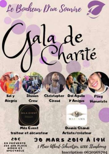 Le Bonheur d’un sourire vous invite à son gala de charité, organisé le samedi 30 mars 2019 à partir de 19 heures au centre socio-culturel «Marcel Marceau» 5 place Albert-Schweitzer 67100 Strasbourg.
