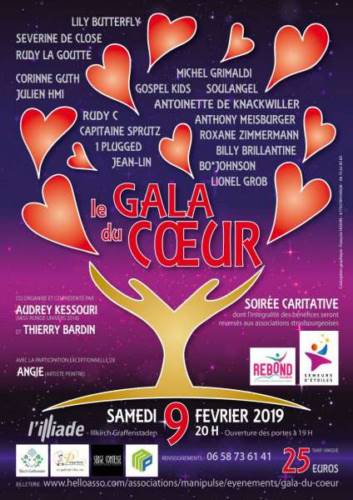 Le gala du cœur est une soirée caritative dont l’intégralité des bénéfices seront reversés aux associations Strasbourgeoises "rebond du coeur" et "semeurs d’étoiles". Il aura lieu le samedi 9 février à 20h à l’Illiade à Illkirch Graffenstaden. Ouverture des portes à partir de 19h15.