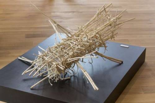 Claude Braun s’est posé des contraintes techniques, en utilisant des matériaux naturels qu’il trouve autour de son site et le reste des matériaux artificiels qu’il utilise de son atelier et qu’il recycle, provoquant des combinaisons antagonistes improbables.