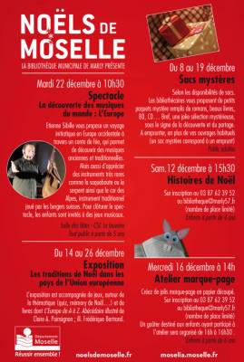 Dans le cadre de la manifestation départementale « Noëls de Moselle », la Bibliothèque de Marly vous propose diverses activités: