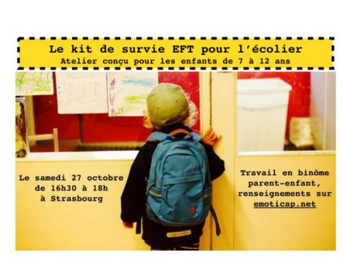 Le kit de survie EFT pour l’écolier est un atelier spécialement conçu pour les enfants de 7 à 12 ans. Le travail se fait en binôme parent-enfant. Pour une description détaillée du déroulement de cet atelier rendez-vous sur emoticap.net rubrique ateliers.