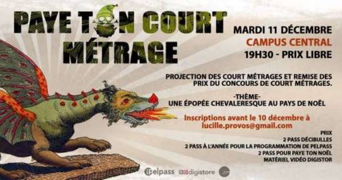 Comme chaque année, l’association Pelpass et Cie propose propose un concours de court-métrage ouvert à tous, dans le cadre du festival Paye ton Noël. Les courts-métrages seront projetés le mardi 11 décembre devant un jury de professionnels au sein de l’amphi 29 du bâtiment l’Escarpe sur le Campus de Strasbourg, et de nombreux lots sont à gagner !