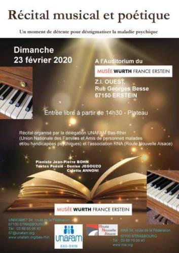 L’Unafam 67 et Route Nouvelle Alsace vous invitent à leur 2e "récital musical et poétique" avec le pianiste Jean-Pierre Bohn ainsi que Denise Jegouzo et Colette Annoni pour les textes, écrits par des personnes souffrant de troubles psychiques. L’événement se déroulera dans la très belle salle de :